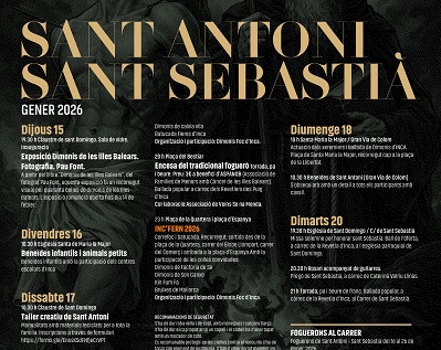 Finalment, dimarts 20 de gener a les 19.30 hores, l’Església de Sant Domingo acollirà la missa solemne per honorar sant Sebastià. L’acte inclourà el ball de l’Oferta, a càrrec de la Revetla d’Inca.